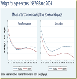 The figure to the left on height shows the protective effect of the program on longer-term nutritional outcomes (reversing the trend in stunting). This result is particularly important in light of the fact that program communities had a higher incidence of shocks and experienced higher food insecurity.